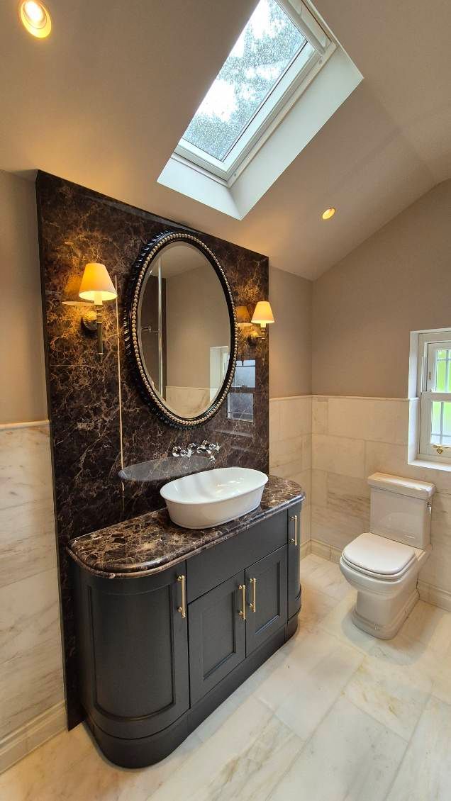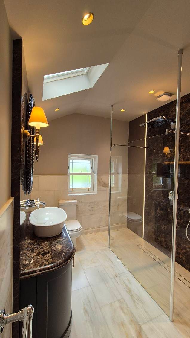 The interior fit-out of the en-suite was designed as a wet room. The floor was tiled on a reinforced concrete slab, with underfloor heating. The walls in the shower area were tiled floor-to-ceiling with single natural granite tiles measuring 3 meters in height. The remaining walls were partially tiled, with painted surfaces above. The ceiling was vaulted to create a sense of space and light, including a Velux skylight for additional natural light.